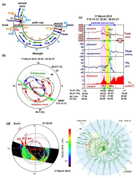 Figure 6 illustrates Event 3 (17 March 2012) observed by DMSP F15 in the Southern Hemisphere. In Figure 6a, the schematic diagram shows (at ~18 MLT) the duskside EEJ within the oval’s equatorward half, the duskward-intruding WEJ within the oval’s poleward half, and the discontinuity between the two electrojets. Through a clockwise rotation, the EEJ/poleward E-field became a WEJ/equatorward E-field. Further illustration is provided by the polar convection map in Figure 6b.