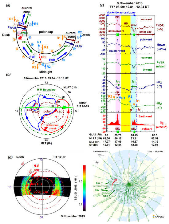 Figure 7 shows the duskside scenario of Event 4 (9 November 2013) observed by DMSP F17 in the Northern Hemisphere. The schematic diagram in Figure 7a (like in Figure 6a) depicts the intrusion of the dawn cell into the dusk cell at ~18 MLT, as well as a scenario where the EEJ appeared equatorward of the WEJ. Along the discontinuity, the EEJ rotated clockwise and became a WEJ.