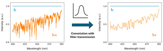 High-resolution spectra were simulated to calculate the dependence of the intensity ratio on the concentration of NO2, GLY, MGLY, O3 and water vapour. The simulation procedure is shown schematically in Figure 1. Synthetic intensity spectra were created with a wavelength interval of 0.01 nm, and the effect of absorption by different concentrations of the species of interest was calculated using high-resolution literature spectra for NO2 [68], GLY [63], MGLY [69] and O3 [70]. The high-resolution absorption spectrum of water vapour was calculated between 22,000 cm−1 (454.5 nm) and 23,000 cm−1 (434.8 nm) with an interval of 0.02 cm−1 using the HITRAN line parameters for H216O. A temperature of 296 K and 1 atm was assumed [71]. The intensity spectra were then convolved with a Gaussian distribution with a full width at half maximum (FWHM) of 1.44 nm, matching the resolution of the commercially available narrow bandpass filter used in the chamber optical system, smoothing some of the absorption structure. Non-Beer–Lambert Law behaviour arising from not resolving the narrow absorption lines is not expected to pose a problem as the fractional intensity change from gas absorption in this spectral region is small even over kilometre pathlengths.