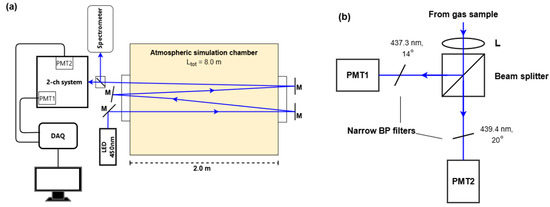 (a) Optical setup across a 2.65 m3 atmospheric simulation chamber with an optical pathlength of 8.0 m through the chamber. Transmitted light was measured by a spectrometer for DOAS analysis and by the two-channel detection system. (b) Optical and detector configuration of the two-channel system.