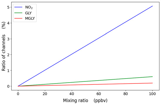 The simulated response of a two-channel instrument, where λ1 = 437.3 nm and λ2 = 439.4 nm, is shown in Figure 3 for NO2, glyoxal and methylglyoxal under different loading conditions over a pathlength of 1000 m. The use of a narrow bandpass filter to choose the system operating wavelengths allows the selection of operating wavelengths that are less affected by these interfering compounds. As expected from Table 1, the spectral interference from methylglyoxal is negligible at these mixing ratios, especially considering that methylglyoxal is typically at sub-ppb levels in urban environments [78,79]. The response to glyoxal is larger, resulting in positive interference and the overestimation of NO2. Nevertheless, glyoxal normally occurs at sub-ppb mixing ratios in urban environments [76,77,81,82]; at these concentrations, the effect on NO2 measurements will also be minor [83,84]. Ozone absorption is negligible—for example, 40 ppb O3 would contribute 0.1% of that of 4 ppb NO2 (Table 1).