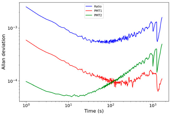 Allan deviation of two PMTs and of their ratio in the 8 m system across the atmospheric simulation chamber.