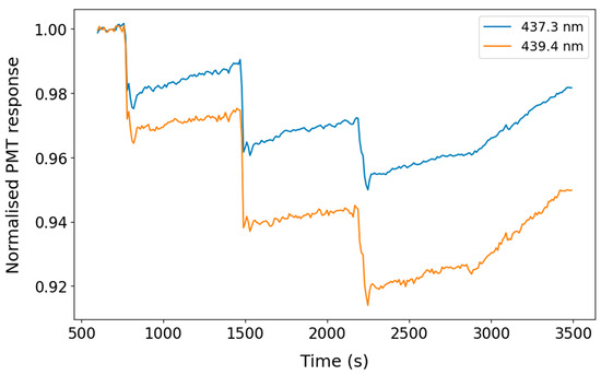 After the fourth pass, the beam was split into two channels. In one channel, the spectrum was measured with a spectrograph (Andor, Shamrock 163, Belfast, UK) and a CCD detector (Andor iDUS, DV420A-BU, Belfast, UK) with a spectral resolution of 0.4 nm. In the other channel, the beam was collimated with a lens (a focal length of 250 mm), split into two arms (Figure 2b), each of which comprised a narrow bandpass filter (Semrock LL01-442-12.5, New York, NY, USA) and a photomultiplier tube (PMT) module (Hamamatsu H12405, Shizuoka, Japan). The narrow bandpass filters (FWHM = 1.44 nm) were oriented for maximum transmission at 437.3 nm and 439.4 nm. The angle dependence of the spectral transmission band and bandwidth is shown in Figure S2.