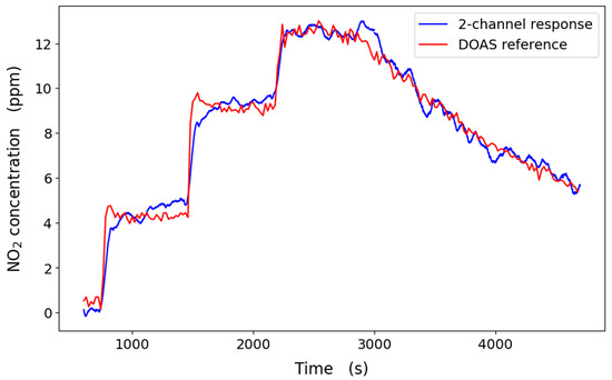 Calibrated ratiometric two-channel response (Savitsky–Golay filtered over 60 data points) compared with DOAS reference concentrations.