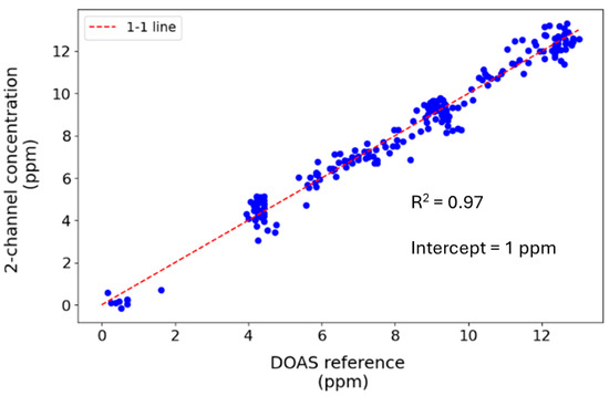 Correlation plot of 1 min averaged concentrations measured by the ratiometric two-channel and DOAS reference instruments (R2 = 0.97, intercept = 1 ppm).