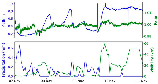 A composite time series of measurements from 7 to 11 November 2024. The upper panel shows the measured intensity at 438 nm (normalised to the peak intensity) and the ratio of intensities in two wavelength bands (438.0 nm to 438.5 nm and 439.0 nm to 439.5 nm). The lower panel shows the corresponding precipitation and visibility recorded at the Cork Airport meteorological station.