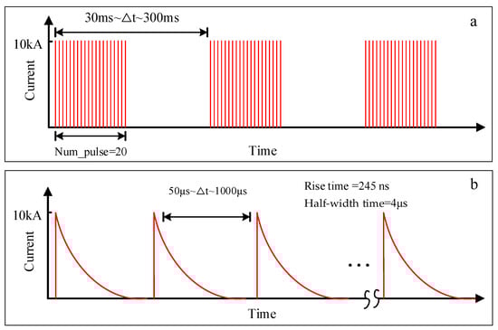 Natural lightning frequently demonstrates repetitive pulse (RP) discharge phenomena on the microsecond time scale during its occurrence and development. In the lightning test standards of SAE ARP 5412C [1] and section 22 in RTCA DO-160G [2], the test specifications of multiple burst (MB) waveform were set as three bursts of current pulses characterized by random time intervals of 30 to 300 ms, which are comprised of Component H waveforms with a leading edge time of 0.245 μs and a half-width time of 4 μs, and the time interval of individual pulses is 50 to 1000 μs, as illustrated in Figure 1.