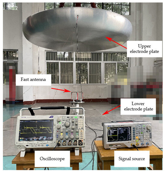 Figure 4 presents the schematic diagram of the laboratory calibration process for the fast antenna. In this setup, the metal disc serves as the upper electrode plate, while the grounded metal plate acts as the lower electrode plate. The upper electrode plate is connected to the output port of the signal source via a coaxial cable, and the lower electrode plate is electrically grounded. The fast antenna is positioned at the center of the metal floor, and the oscilloscope is employed to measure the output signal from the fast antenna. Specifically, the signal source is a Rigol DG4162 function/arbitrary waveform generator with an internal impedance of 50 Ω, capable of producing stable and continuous waveforms. The oscilloscope is a Tek 3024 model, featuring a bandwidth of 200 MHz and a maximum sampling rate of 2.5 GHz.
