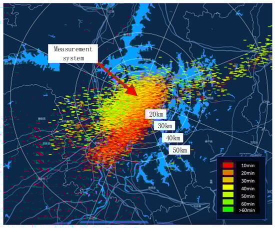 The distribution of lightning locations in the vicinity of the measurement system between 10:00 and 11:00 on 29 June 2022.