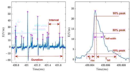 For the collected signal waveforms, time-domain characteristic parameters of repetitive pulse discharge events were extracted. These parameters primarily include the number of pulses in a pulse sequence, the duration of a pulse sequence, the minimum pulse interval, the average pulse interval, the average half-width and full-width of the pulse, the pulse rise time, and the pulse fall time, as depicted in Figure 7 in which the plus sign indicates the location of the extracted pulse peak point. Specifically, the rise time is defined as the time difference between 10% and 90% of the peak value of the rising edge, characterizing the high-frequency components of the signal. The fall time is defined as the time difference between 90% and 10% of the peak value of the falling edge, characterizing the low-frequency components of the signal. The half-width time refers to the time width of the pulse between two adjacent half-peak points.