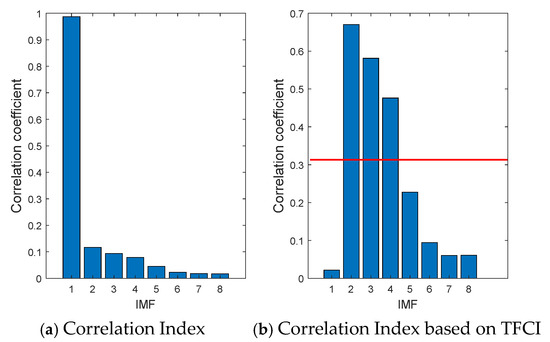 Table 2 lists the detrended cross-correlation index values between each modal component and the original signal, while Figure 11 illustrates the comparative effectiveness of the correlation index and the detrended cross-correlation index in distinguishing meaningful components, the red line in Figure 11b denotes the mean of the correlation coefficients.