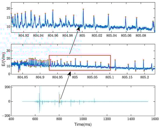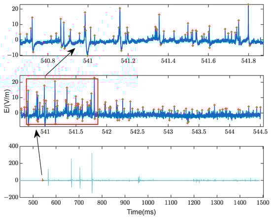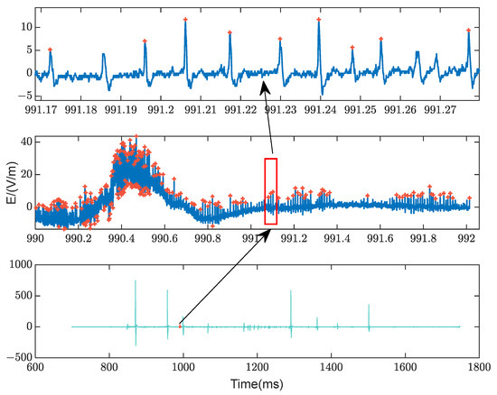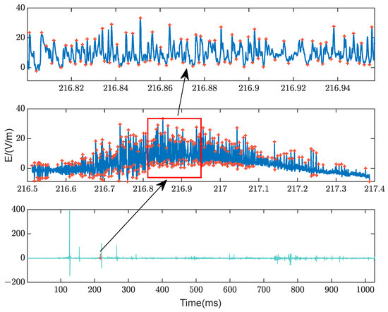 To address the aforementioned issues, VMD is employed to decompose the VLF/LF electric field waveforms of lightning into multiple intrinsic mode functions (IMF). Subsequently, the Trend-Free Correlation Index (TFCI) is applied to screen and retain appropriate intrinsic mode functions. TFCI involves calculating the correlation coefficients between each IMF and the original signal on an individual basis. Subsequently, signal reconstruction is carried out by utilizing only those IMFs whose correlation coefficients exceed the mean value of all computed correlation coefficients, thereby achieving signal detrending. This process effectively removes slowly varying low-frequency components and relatively high-frequency noise. This thus provides the possibility of determining the pulse peaks based on the comparison of amplitude features. However, some broadband background noise remains in the retained useful signals. To mitigate this, the pulse threshold can be set as twice the average amplitude of the noise. By establishing criteria such as the minimum peak height, the minimum relative peak height difference, and the minimum peak interval, effective pulse peak points can be identified. Furthermore, by defining the minimum pulse time interval threshold, portions of the pulse sequence in time can be extracted, allowing for the statistical analysis of the number of pulse peaks and related time-domain parameters within these portions.