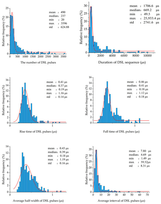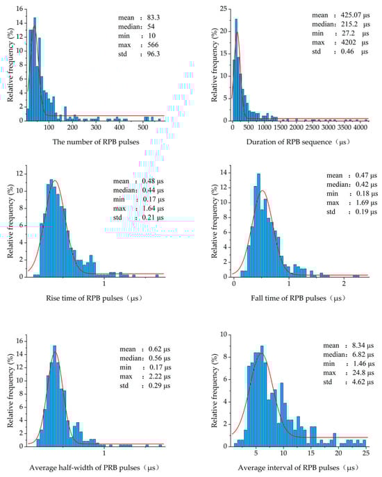 As shown in Figure 14, the statistical results indicate that the pulse burst duration ranges from 27.2 μs to 4202 μs (with an average of 425.07 μs and a median of 215.2 μs), the pulse repetition count varies between 10 and 566 (with an average of 83.3 and a median of 54), the average half-width time of a single pulse is within 0.17 μs to 2.22 μs (with an average of 0.62 μs and a median of 0.56 μs), the average pulse interval time spans from 1.46 μs to 24.8 μs (with an average of 8.34 μs, and a median of 6.82 μs), the average rise time is between 0.17 μs and 1.64 μs (with an average of 0.48 μs and a median of 0.44 μs), and the average fall time ranges from 0.18 μs to 1.69 μs (with an average of 0.47 μs and a median of 0.42 μs).