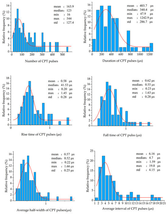 A typical CPT time-domain waveform is presented in Figure 15. Given the irregularity of the pulse shape, pulse width, and pulse peak in the CPT pulse train, it is challenging to accurately determine the start and end times of each pulse. Nevertheless, by setting a threshold at twice the noise level, the pulse train data segment can be extracted, and the average time-domain parameters can then be statistically analyzed. Due to the inherent irregularities of the CPT waveform, significant individual variations still exist in the average time-domain parameters.