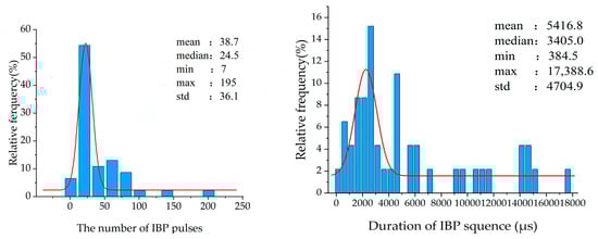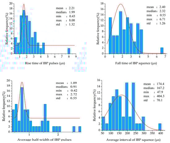 The repetition count of IBPs ranges from 7 to 195 (with an average of 38.7 and a median of 24.5), following a normal distribution overall. The pulse sequence duration spans from 384.5 μs to 17,388.6 μs (with an average duration of 5416.8 μs), also exhibiting a normal distribution. The average pulse interval time varies between 47.9 μs and 404.3 μs (with an average of 174.4 μs). Approximately 93.4% of the samples have a half-width time within 2 μs. The rise time exhibits a distribution within the interval of 0.43 to 0.8 μs, with a mean value of 2.21 μs and a median of 1.99 μs. The fall time demonstrates a distribution ranging from 0.55 to 6.71 μs, featuring an average of 2.4 μs and a median of 2.32 μs. These statistical results are illustrated in Figure 20.