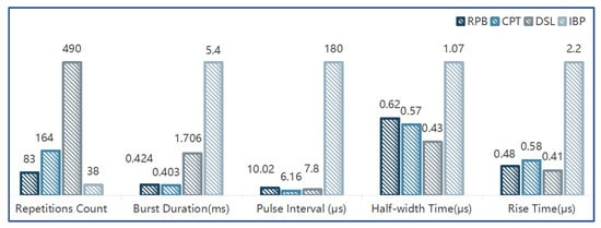 Based on the aforementioned statistical analysis, Figure 21 presents a comparative evaluation of the average time-domain parameter values for RPB, CPT, DSL, and the IBP. DSL exhibits stepwise development within the pre-established lightning return stroke channel, which can extend several kilometers in length. Consequently, it demonstrates the longest burst duration and the largest pulse repetition count. An IBP typically occurs during the initial phase of lightning activity, prior to the formation of the leader discharge channel, resulting in the longest pulse interval and pulse rise time. Furthermore, when considering parameters such as pulse interval, half-width time, and rise time, the waveforms of RPB and DSL exhibit significant similarity.