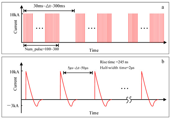 Dart-stepped leader (DSL), which occurs subsequent to the initial lightning return stroke, exhibits a more optimized discharge channel compared with the stepped leader (SL). Consequently, it demonstrates a higher pulse repetition frequency and imposes stricter requirements on the standard testing environment for lightning protection systems. In this paper, DSL is selected as the primary subject of analysis. According to Rakov et al. [3], the pulse width of DSL typically ranges from 1 to 2 μs, with a pulse interval of 6 to 8 μs. Furthermore, Qie et al. [22] reported that the duration of the DSL pulse train is approximately 7.7 ms, the pulse interval is around 12.2 μs, and the pulse half-width is about 0.5 μs.