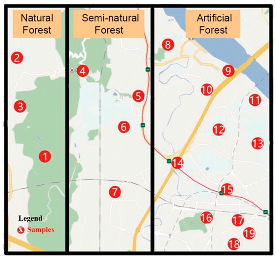 There were forest lands in the study area, which “forest land” referred to the land covered by natural, secondary, or artificial forest. They were divided into five vegetation types, three disturbed plant communities, and five green space types. A vegetation type was the aggregation of plant communities based on the uniformity of life forms (primary or secondary), the same or similar edificator species, and the requirements for water and heat conditions. The five different vegetation types included evergreen broad-leaved forest, mixed forest, coniferous forest, deciduous broad-leaved forest, and sparse forest lawn (Table A1). The three kinds of plant communities were categorized into different disturbance types, i.e., natural, semi-natural, and artificial communities. The land use types were classified into three categories (Table A1): the first included urban lands such as roads, industry, public utilities, residential areas, and open space, i.e., the control for each quadrat with impermeable cover as well; the second included forest lands covered with semi-natural, broad-leaved evergreen, conifer-broad, artificial, deciduous, coniferous, and natural forests; and the third included green lands covered with gardens and grassland with sparse trees referred to as “Standard of urban green space classification, China” (CJJT85-2002) [28].