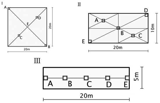 The quadrats for community were divided into two types, one of which was a square and the other a rectangle. First, the square was 20 m × 20 m in size. In order to detect the concentration of PMs both inside and outside the quadrat, five monitoring points were set up per quadrat, as shown in Figure 2I. Therein, A and B are the end points of the diagonal line, C and D are respectively at the 1/4 length from the end of the other diagonal line of the quadrat, E was the intersection of the two diagonal lines, and A, B, C, D, and E were set as monitoring points of a square quadrat. Second, the rectangular quadrat is 10 m × 20 m and 5 m × 20 m, as shown in Figure 2II,III. In order to measure the concentration of air particulate matter in the edge and interior of the former (Figure 2II), five monitoring points were also set up, wherein D and E were the end points of a diagonal line, A and C were the respective 1/4 length from the end of the other diagonal line of the quadrat, B was the intersection of the diagonal line, and A, B, C, D, and E were the monitoring points of a rectangle quadrat. In the latter one of the 5 m × 20 m rectangle quadrats (Figure 2III), five bisector points were taken as monitoring points of the sample in the midpoint connection line along the wide side of the rectangle quadrat.