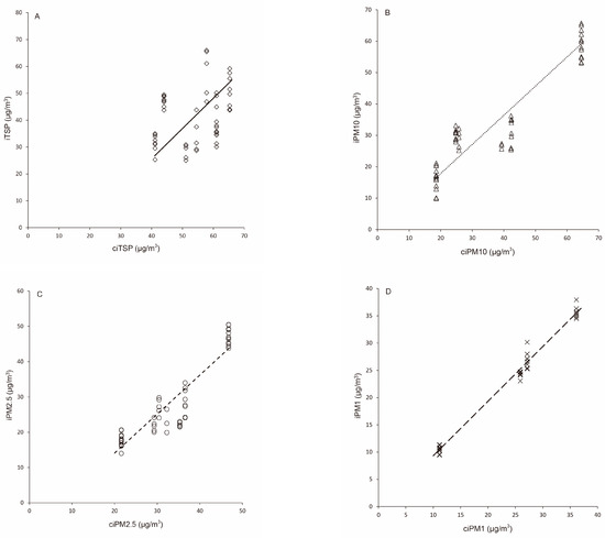 The relationships among the ciPMs with different particulate sizes in control were consistent with the above correlations, with one exception: the negative correlation of ciTSP vs. ciPM1 was significant (r = −0.698, p < 0.01). The details for these were omitted here.