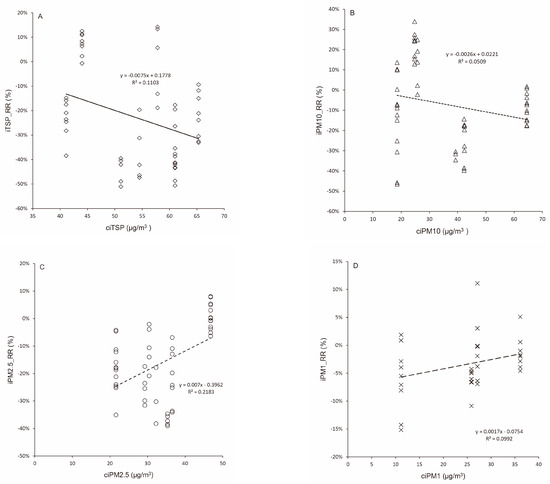 There was a negative correlation in iTSP_RR vs. ciTSP (r = −0.332, p = 0.016; Figure 4A), but there was no significant one in iPM10_RR vs. ciPM10 (r = −0.225, p = 0.108; Figure 4B), and there was a positive correlation both in iPM2.5_RR vs. ciPM2.5 (r = 0.467, p < 0.001; Figure 4C) and in iPM1_RR vs. ciPM1 (r = 0.315, p = 0.023; Figure 4D).