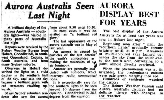 The sources of the aurora event presented in this work are news items published in the Australian newspapers The Sydney Morning Herald (from Sydney, New South Wales) and the Mercury (from Hobart, Tasmania). These newspapers were important documentary sources publishing information on natural phenomena and scientific news items in mid-20th century Australia. Note that newspapers were a key means of disseminating information about unusual occurrences such as auroras.