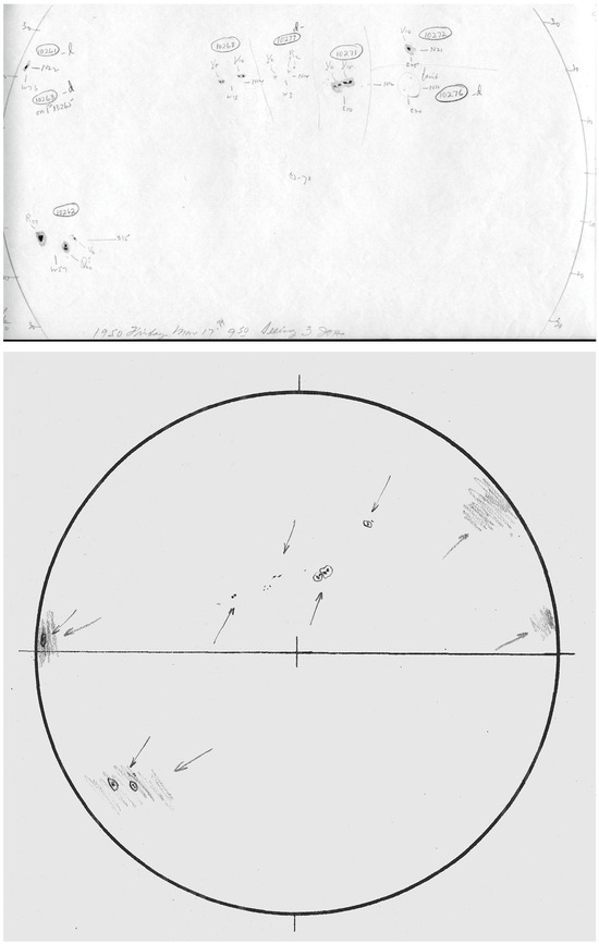 Sunspot drawings recorded in the Mount Wilson Observatory (top panel) and Sacramento Peak Observatory (bottom panel) on 17 March 1950 [Sources: http://fenyi.solarobs.epss.hun-ren.hu/GPR/, accessed on 17 April 2025; https://www.ngdc.noaa.gov/stp/, accessed on 17 April 2025].