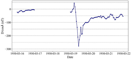 where H is the observed value of the hourly H-component magnetic field, B is the baseline of H, and Sq is the solar quiet daily variations. We selected B as H hourly value of the pre-storm level at 1 h UTC on 19 March 1950. We selected five quiet days previous to the storm (26 February and 10–13 March) based on the revised daily Aa index by Lockwood et al. [24,25] to calculate the Sq variations. Then, it is divided by the cosine of its magnetic latitude (25.77° N). Figure 3 depicts the magnetic disturbance values estimated for the geomagnetic storm on 19 March 1950.