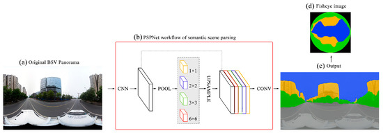 Figure 2). The study prioritized critical urban elements including sky, vegetation, and building categories within street scenes. A semantic segmentation framework was established based on the Pyramid Scene Parsing Network (PSPNet), with ResNet serving as the backbone architecture. Hierarchical feature fusion mechanisms were employed to integrate multi-scale contextual information from the imagery.