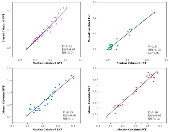 2 values between 0.89 and 0.96 and root mean square errors (RMSE) consistently within 0.03–0.05. These metrics substantiate the methodological reliability and computational accuracy of the Baidu Street View-based segmentation framework for VF and GVI assessments.