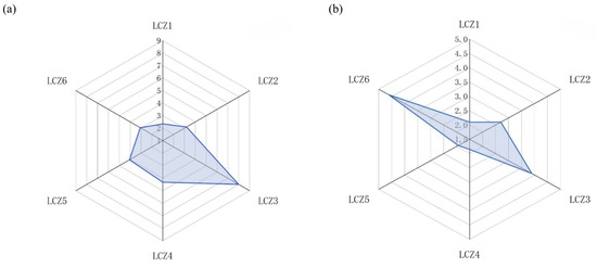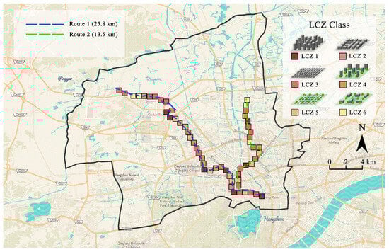Figure 5), comprising Route 1 (25.8 km) and Route 2 (13.5 km). These routes were strategically designed to traverse six distinct LCZ categories within the urban matrix, ensuring comprehensive coverage of morphological diversity across the study area.
