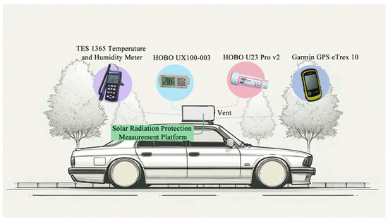 Figure 6). A radiation-shielded enclosure mounted on the vehicle roof housed three primary environmental sensors: 1. TES-1365 Temperature (0.1 °C resolution, ±0.4 °C accuracy, 3 s sampling interval); 2. HOBO UX100-003 data logger; 3. HOBO U23 Pro v2.0 temperature/humidity recorder. Spatial referencing was achieved through a Garmin GPS eTrex 10 receiver configured for 1 s epoch data collection, ensuring sub-meter georeferencing accuracy through real-time kinematic positioning. Concurrent route navigation was managed via the “Two-step Road” mobile application, while situational awareness documentation included timestamped photographic records of sky conditions and transient events (e.g., passing water trucks, traffic anomalies) captured via smartphone devices. This multimodal data collection framework enables rigorous traceability analysis and systematic processing of anomalous datasets through cross-referenced spatiotemporal metadata.