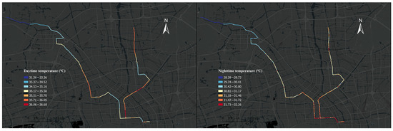 To investigate the spatio-temporal differentiation patterns of urban street thermal environments, this study established two distinct observation windows: 14:00–15:00 (daytime) and 23:00–24:00 (nighttime). Mobile measurements were conducted at a constant vehicle speed of 30 km/h, with each 90 min sampling campaign designed to minimize temporal variability effects. Data collection occurred in August and September 2023, comprising five daytime and five nighttime surveys to ensure comprehensive environmental characterization. All mobile measurements were systematically carried out under strictly controlled meteorological conditions. The selected measurement days were clear and cloudless (cloud cover < 10%) with wind speeds below 2 m per second to ensure the comparability of the temperature measurement results.
