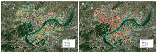 The UHI effect becomes particularly pronounced at night due to the low thermal capacity of urban surfaces. During daytime, these surfaces absorb substantial solar radiation, releasing stored heat after sunset and elevating nocturnal temperatures. Building clusters obstruct longwave radiative cooling while synergizing with vehicular emissions, creating significantly higher temperatures in UHI cores compared to suburban areas. As illustrated in the figure, the Qian Tang River and its riparian zones exhibit relatively lower temperatures, attributable to the high specific heat capacity of water bodies modulating ambient temperatures. Urban green spaces and parks also contribute to localized cooling by providing microclimatic refugia. Elevated temperatures along major roadways arise from combined effects of vehicle emissions and high thermal conductivity of pavement materials. Slow nocturnal heat dissipation in traffic-intensive zones sustains elevated temperatures across multiple blocks, potentially triggering extended UHI phenomena. This not only degrades residential quality of life, especially for elderly populations, but also amplifies heat-related morbidity risks, exacerbating dual burdens on public health and urban energy systems.