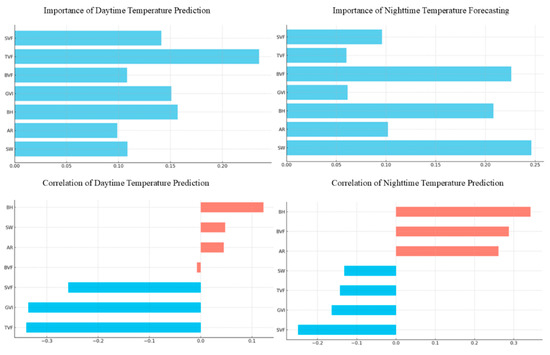 (6) Three-dimensional morphological indicators such as Building Visibility Factor (BVF) and Tree Visibility Factor (TVF) show diurnal differences in temperature contributions: TVF and building height (BH) dominate daytime, while street width (SW) and BH dominate nighttime.