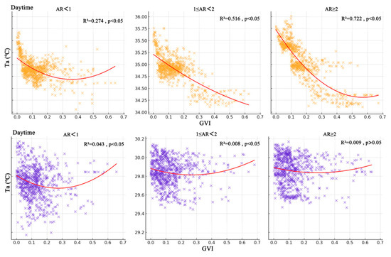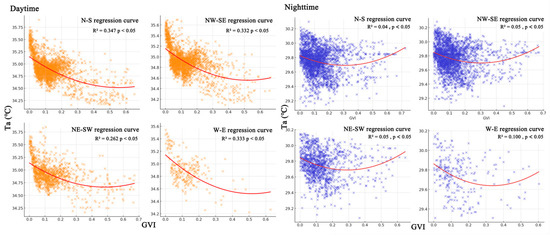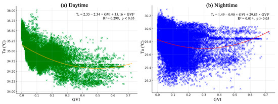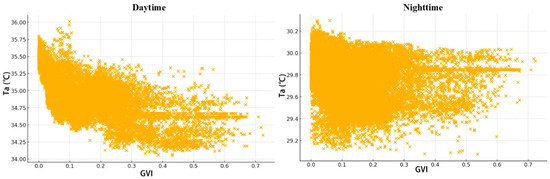 43]. However, these studies have not addressed the regulatory effects of vegetation’s three-dimensional distribution on nocturnal thermal environments. The present research confirms the negative GVI-Ta correlation observed in prior studies [