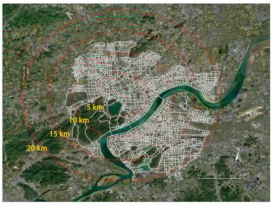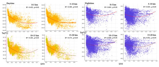 (3) GVI’s regulatory effect on urban temperature presents significant spatio-temporal heterogeneity and nonlinear characteristics. The 10–15 km gradient zone shows the most prominent daytime cooling, attributed to synergistic effects of moderate development intensity and function-oriented green space configuration. At night, the 15–20 km gradient zone exhibits enhanced vegetation cooling in exurban areas, relying on radiative cooling from intact vegetation patches and low anthropogenic disturbance. In the 0–5 km urban core, thermal regulation by GVI is significantly suppressed due to high-density building heat retention, street canyon effects, and hardened surfaces.