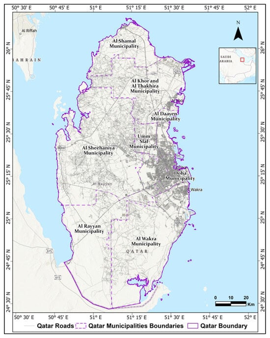The study area is located between latitudes 24°27′ and 26°10′ north and longitudes 50°40′ and 51°40′ east. Qatar is situated midway along the western coast of the Arabian Gulf (see Figure 1). The Qatari peninsula extends northward, encompassing an estimated area of 11,627 km2 [25]. Consisting of multiple islands, reefs, and sandbars, the peninsula spans approximately 185 km from north to south and 85 km from east to west. The Arabian Gulf is accessible via Qatar’s territorial waters, which extend approximately 51 nautical miles to the north and 95 nautical miles to the east. Its only land border, shared with the Kingdom of Saudi Arabia, measures approximately 86 km.