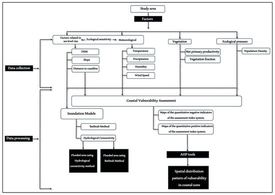 The Coastal Vulnerability Index (CVI) is a tool used to assess the susceptibility of coastal areas to various hazards, such as sea-level rise, storms, and erosion. It integrates multiple physical, environmental, and geological parameters to evaluate vulnerability. The hydrological connectivity method and the bathtub method are both integral to this assessment. The hydrological connectivity method focuses on understanding the flow and interaction of water within a coastal system, including surface and subsurface water movement, which influence factors like erosion, sediment transport, and flooding. This method provides a dynamic perspective on how water connectivity impacts coastal stability. On the other hand, the bathtub method is a simpler, static approach used to estimate inundation areas by assuming a uniform rise in sea level, akin to filling a bathtub. It is often employed to predict flood extents under various sea-level rise scenarios. When calculating the CVI, the bathtub method helps to identify areas at risk of inundation, while the hydrological connectivity method offers insights into the underlying processes that exacerbate or mitigate vulnerability, such as groundwater interactions or sediment dynamics. Together, these methods provide a comprehensive understanding of coastal vulnerability by combining static inundation predictions with dynamic hydrological processes, enabling more accurate and holistic assessments for coastal management and planning. The flowchart in Figure 2 illustrates the coastal vulnerability assessment process, beginning with the data collection of geospatial and environmental parameters. The analysis progresses through the following two complementary flood modeling approaches: (1) the bathtub method, which calculates potential inundation areas using simple elevation thresholds under sea-level rise scenarios, and (2) the hydrological connectivity method, which enhances these results by identifying floodable areas through water flow pathways and drainage connections. Where the bathtub method provides initial risk screening, the hydrological connectivity method delivers more accurate predictions by eliminating hydrologically isolated depressions. These outputs then feed into an Analytic Hierarchy Process (AHP) that weights physical and socioeconomic vulnerability factors, ultimately generating spatial vulnerability patterns to guide coastal protection priorities. This integrated workflow combines rapid assessment capabilities with sophisticated hydrological modeling for comprehensive risk evaluation.