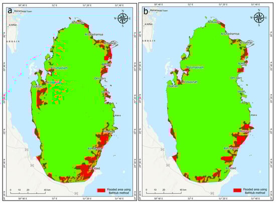 Figure 3 compares the inundation extents under the RCP8.5 (a) and RCP4.5 (b) scenarios using the bathtub method. The RCP8.5 scenario projects a flooded area of 1197.21 km2 (10.13% of Qatar’s total area), whereas the RCP4.5 scenario shows a reduced inundation extent of 973.82 km2 (8.24%). This divergence underscores the critical importance of emission mitigation in limiting the impacts of sea-level rise.