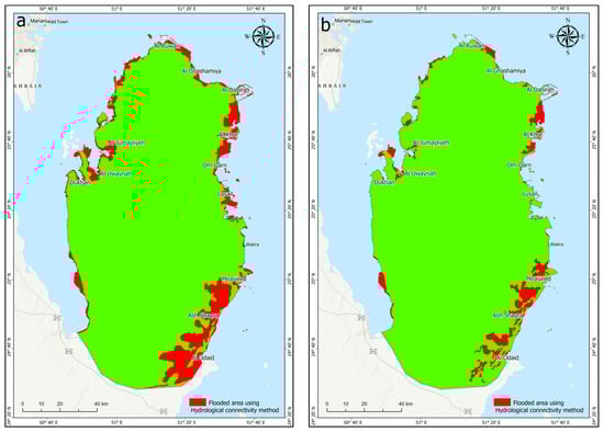 The hydrological connectivity method refined flood predictions by accounting for drainage pathways, eliminating hydrologically isolated depressions. Figure 4 contrasts the inundation extents calculated under the RCP8.5 (a) and RCP4.5 (b) scenarios. Under RCP8.5, 944.09 km2 (8% of Qatar’s total area) was projected as flood-prone, while RCP4.5 reduced this to 508.79 km2 (4.31%). Notably, urban and industrial zones (e.g., Roads/Streets: 30.03 km2 under RCP8.5 vs. 14.97 km2 under RCP4.5) showed significant variability, emphasizing the method’s sensitivity to SLR magnitude. Discrepancies with the bathtub method arose from the exclusion of inland areas disconnected from the sea, demonstrating the importance of dynamic hydrological modeling and its accuracy.