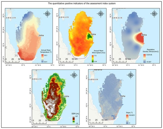 The vulnerability index (CVI) was constructed using a combination of geospatial, climatic, and socioeconomic datasets. Physical parameters (elevation, slope, and distance to coastline) were derived from high-resolution digital elevation models (DEMs) obtained through aerial surveys conducted by the Qatar GIS Center in 2017 (RMSE: 0.1 m). Climatic variables (temperature, precipitation, wind speed, and humidity) were sourced from the Qatar Meteorological Department’s historical records. Socioeconomic data (population density and land use) were acquired from Qatar’s Ministry of Development Planning and Statistics (MDPS, 2015). Vegetation indices (NDVI) and net primary productivity (NPP) were extracted from Sentinel-2 satellite imagery (10 m resolution). All datasets were harmonized to a common spatial resolution (30 m) and coordinate system (WGS 84 UTM Zone 39N) within ArcGIS 10.8 prior to analysis.