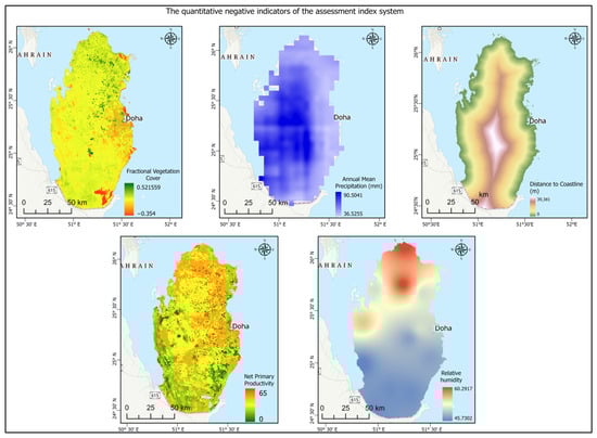 Figure 6 represents the negative factors, which encompass average yearly rainfall, mean annual humidity levels, proximity to the shore, fractional vegetation cover (FVC), and net primary productivity.