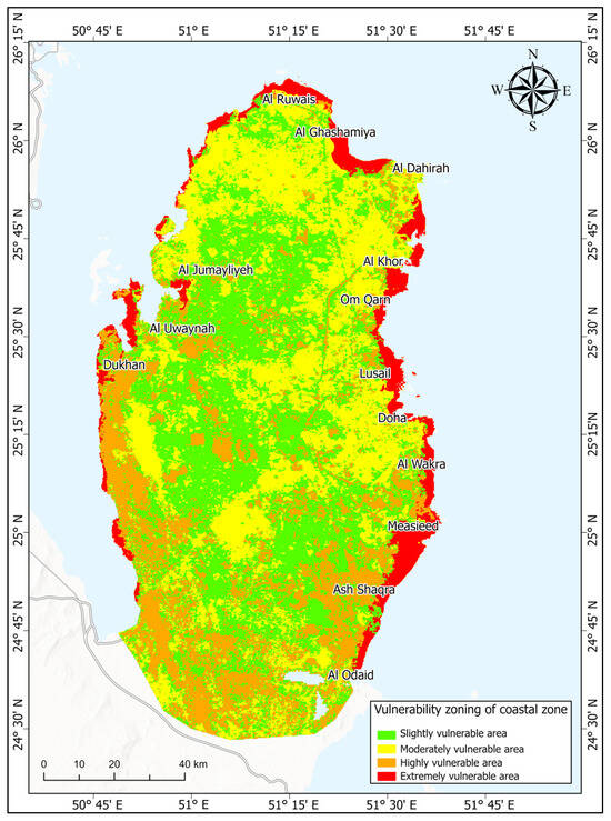 In the final stage, all criteria were combined using AHP overlay analysis tools in ArcGIS 10.8 to produce a vulnerability map. Figure 7 presents the vulnerability zoning of coastal areas for Qatar. The figure illustrates the results of an overlay of the 10 criteria. The weighting of each criterion played a significant role in determining the distribution of vulnerable areas. The map delineates four vulnerability levels for coastal areas, categorized as extremely vulnerable, highly vulnerable, moderately vulnerable, and low vulnerable.