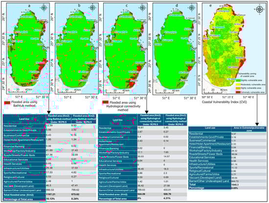Predicted coastal inundation in Qatar under RCP8.5 (a) and RCP4.5 (b) scenarios using the hydrological connectivity method, RCP8.5 (c) and RCP4.5 (d) scenarios using the bathtub method, and (e) coastal zone vulnerability distribution: Extreme risk areas and flood modeling results.