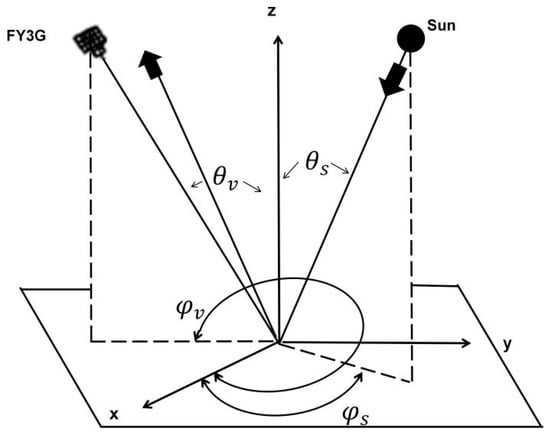 Figure 1 presents a schematic illustration of the sun glint geometry and the corresponding angle definitions. The arrows indicate the incident direction of solar radiation and the reflected direction off the ocean surface, respectively. The symbol represents the solar zenith angle, which is the angle between the local pixel geodetic zenith and the solar direction. The symbol represents the solar azimuth angle, which is the clockwise angle from the local pixel geodetic north to the solar direction when viewed from above. The symbol represents the satellite zenith angle, which is the angle between the MWRI-RM line-of-sight vector and the zenith vector normal to the Earth’s ellipsoid. The symbol denotes the satellite azimuth angle, which is the clockwise angle from the local pixel geodetic north to the satellite’s direction when viewed from above. The sun glint angle can be used as an indicator for identifying sun glint contamination. However, because of the absence of the sun glint flag in the MWRI-RM L1 data, the sun glint angle was calculated and defined by the following equation in this study [22]: