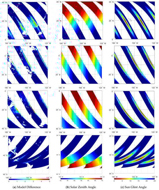 Figure 2b illustrates the spatial distributions of the solar zenith angle on 5, 11, 14, and 28 February 2024. It can be found that the high model difference values coincide with the solar zenith angle in the range of 45° to 60°, close to the instrument incidence angle. The MWRI-RM instrument performs conical scanning, maintaining a constant incident angle of 50°. As the solar zenith angle within FOVs is closer to 50°, the specular reflection direction of solar radiation approaches the incidence angle of MWRI-RM. This phenomenon results in the sun glint angle approaching 0°, enabling reflected solar radiation to enter the MWRI-RM antenna and contaminate measurements consequently. Because of its non-sun-synchronous orbital design, the FY-3G experiences daily variations in its geometry relative to the Sun. This dynamic relationship alters the solar zenith angle for fixed surface pixels over time. Consequently, the contaminated FOVs move back and forth between the latitudinal bands of the Northern and Southern Hemispheres along the scanning swath over a 30-day cycle.