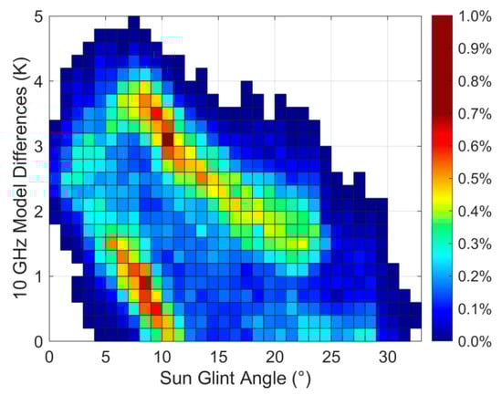Given the absence of sun glint flags in MWRI-RM L1 data products, there is an urgent need to obtain a threshold angle for sun glint flagging. Figure 3 presents a 2-D histogram of the 10.65 GHz model differences versus sun glint angles for the contaminated observations collected between November 2023 and July 2024. The colorbar in Figure 3 indicates the occurrence of contaminated observations for each bin. The percentage is calculated over the total number of contaminated pixels. To prevent excessive counts from degrading the visual quality, the colorbar displays the percentage of contaminated observations for each bin rather than counts. The sun glint angle bins are characterized by a distance of 1°, while the model difference bins are characterized by 0.2 K. The data points included in this analysis were selected from every swath with model difference values in the 0–5 K range. The reasons for selecting data with positive index values are as follows: (a) Solar radiation reflected into the MWRI-RM antenna increases observed brightness temperatures, resulting in positive model difference values. (b) Larger positive values indicate a more significant sun glint impact on the observation accuracy, while negative values cannot stand for sun glint contamination. (c) Sun glint contamination is not denoted by negative values in the model simulation. As illustrated in Figure 3, a clear trend is evident: the model differences negatively correlate with the sun glint angles. A greater magnitude of the sun glint angle implies less probability of sun glint contamination. Specifically, when the sun glint angles range from 25° and 30°, the model difference values mostly fall within the 0–1 K range. Sun glint contamination occurs significantly less frequently compared to the circumstances of the sun glint angle between 0° and 25°. Additionally, in the lower sun glint angle bins, especially 0° and 10°, there are more observations with relatively higher model differences (up to 4–5 K).