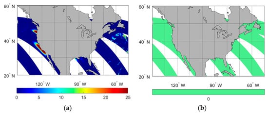 Figure 4 shows the spatial distributions of the index I (a) at the horizontal polarization of the MWRI-RM 18.7 GHz channel and the identification flag of radio frequency interference (b), which is RFI-Flag-recorded in the MWRI-RM L1 data, over the global ocean on 7 April 2024. The regression coefficients at 18.7 GHz have been given in Table 2. The training dataset utilized for establishing the simulation model of the 18.7 GHz channels is the same as that for the 10.65 GHz channels. Figure 4a shows the distinct highlighted color areas along the west coast of the United States. As mentioned above, these highlighted areas indicate the presence of TFI. The observed spatial–temporal patterns of TFI along the coastline of the U.S. are consistent with previous studies [33]. These studies reveal that intense TFI signals come from DirecTV satellites positioned near Hawaii and along the U.S. western and eastern coasts. Figure 4b shows the RFI-Flag in the MWRI-RM L1 data, which indicates a detection flag for radio frequency interference. RFI-Flag divides the pixel quality into two levels. A value of 0 means that the pixels are without RFI. A value of 1 means that the pixels are with RFI. As is shown in Figure 4b, there is no impact from RFI, and no TFI is detected, in contrast to the situation where TFI appears on the west coast of the United States in Figure 4a. Therefore, the model regression difference method effectively identifies TFI signals in regions where the RFI-Flag in MWRI-RM L1 data fails to detect them. Moreover, the sun glint contamination at 10.65 GHz is present in every orbit and moves regularly on a daily basis. The key characteristic of sun glint contamination is its spatial distribution related to solar geometry, specifically the sun glint angle. In contrast, pixels affected by TFI signals exhibit distinct temporal–spatial behaviors: they remain spatially stationary and temporally persistent, consistently appearing in regions illuminated by geostationary television satellite footprints. The distinct characteristics of TFI signals and sun glint contamination enable clear differentiation between their respective contaminated pixels. As described in previous studies, the TFI-free brightness temperature at 18.7 GHz channels can be predicted according to Equation (1) [32].