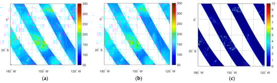 As described previously, sun glint only increases the brightness temperature of low-frequency channels. Therefore, the contaminated brightness temperature at low-frequency channels can be predicted using higher-frequency channels. To verify whether the model regression difference method can correct the contaminated brightness temperature, the observed brightness temperature of the 18.7 GHz horizontal polarization channel was selected as test data for correction. Figure 5 shows the spatial distributions of the observed brightness temperature (a), model-simulated brightness temperature (b), and the difference between the observed and simulated brightness temperatures (c) at the horizontal polarized MWRI-RM channel of 18.7 GHz on 10 February 2024. It can be seen that the simulated brightness temperature is highly consistent with the observed brightness temperature, with small discrepancies between them. Figure 5c shows that there are some pixels with large model differences (well above 5 K). Taking the selection of the training dataset into account, the difference values between the model simulations and observations may notably increase when the pixels are under specific rainy or cloudy conditions.